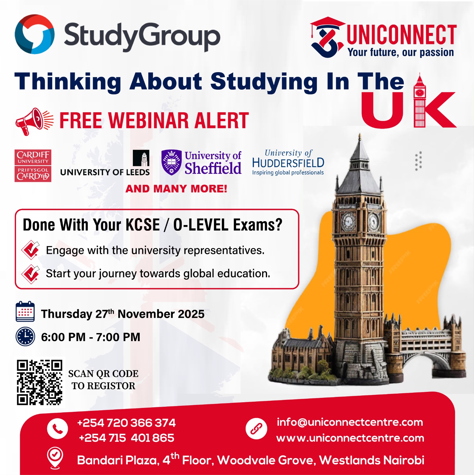 Calling all KCSE/O Level Graduates! We at UNICONNECT CENTRE are giving you the rare opportunity to have an insightful discussion about studying in the UK . Find out the numerous courses available and prestigious universities offering these extensive courses! Get this, you stand a chance to benefit from the various discounts and scholarships that they have to offer!